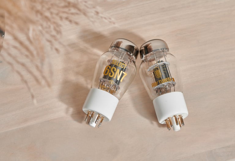 The Ray Tubes 6SN7 SELECT Vacuum Tubes enhance your Limestone amplifier with exceptional improvements in clarity, texture, and detail, thanks to meticulous, engineer-led selection and gold pins for superior conductivity and durability.